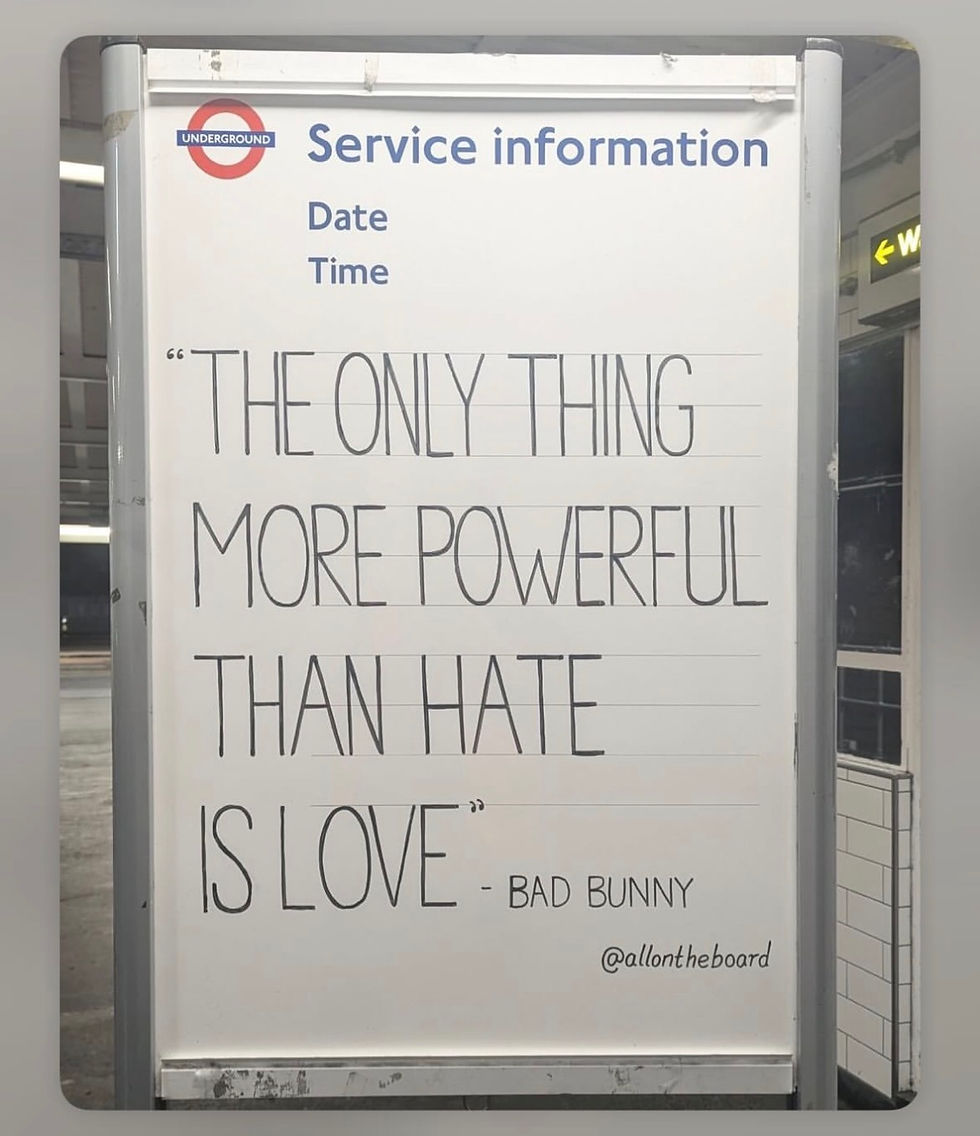 Y en el recuerdo, la frase tipo Yoda que pronunció el rapero en la gala de los Grammy hace una semana: "Lo único más poderoso que el odio es el amor". Y hoy se encuentra en el metro de Londres.