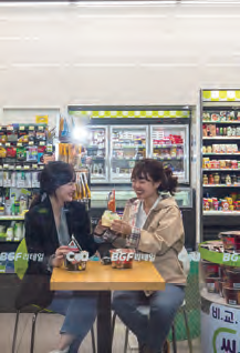 Respecto a las compras y comida, quisiera presentar la cultura del uso de las tiendas de conveniencia en Corea. Son las tiendas abiertas 24 horas donde venden comida instantánea de todo tipo como kimbap y tteokbokki, y se pueden comer en la misma tienda.